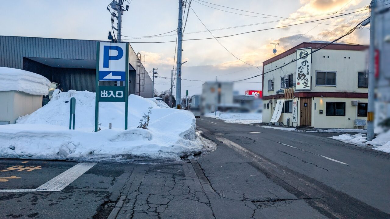 場所は旭川市春光1条7丁目となります。ダイイチ 花咲店やMEGAドン・キホーテ 旭川店の建物の裏の通りにお店があります。ちょうど無印良品 旭川花咲店の建物の裏手と言えば分かりやすいかと思います。昼夜問わず人通りも車通りも多い一帯です。