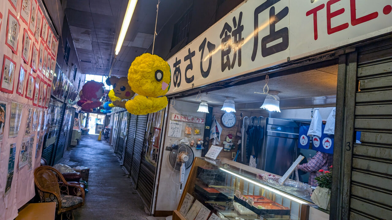 「第一市場」の入口から入ると、かつては賑わっていた市場内もシャッターが下りたままとなっているところも多くなりました。まっすぐ進むと「あさひ餅店」が見えてきます。旭川の皆様にはお馴染みになっていますね。某テレビ番組で「いちご大福」が取り上げられて以来、連休などになると大勢のお客さまが旭川だけではなく、全道各地から訪れる人気の老舗和菓子店です。