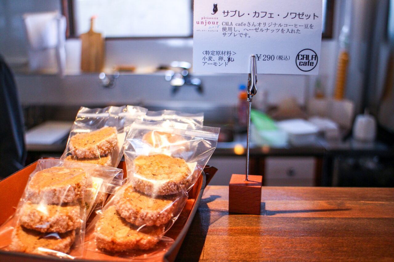 お店には「パティスリーアンジュール2018」さんの焼き菓子も並びます。また両店のコラボ商品である「サブレ・カフェ・ノワゼット」も販売中です。またピアスも多く並んでおり、店主さんいわく、お店には店主さんの好きなものが並んでおり、好きなものに囲まれて過ごしたいとのことです。今後も「好きなもの」のみ増える予定だそうです。
