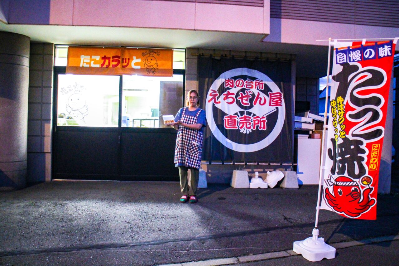 いつも明るくほがらかな店主さん。「いまだにたこのからあげのお店と間違われます」と笑いながら話していました。たこやきとからあげメインのお店で、肉は隣接している「北の台所 えちぜん屋」と同じものを使っています。寒くなって熱いものを食べたい季節。ぜひたこやきやからあげで身体を温めてくださいね。