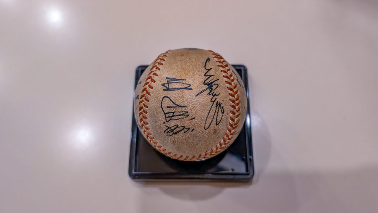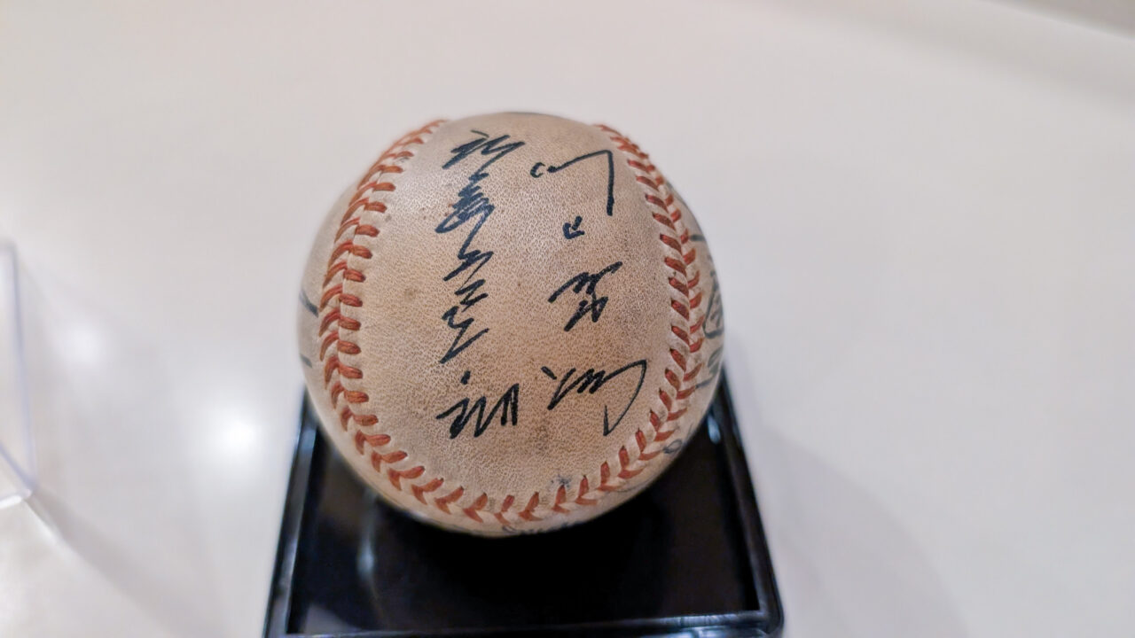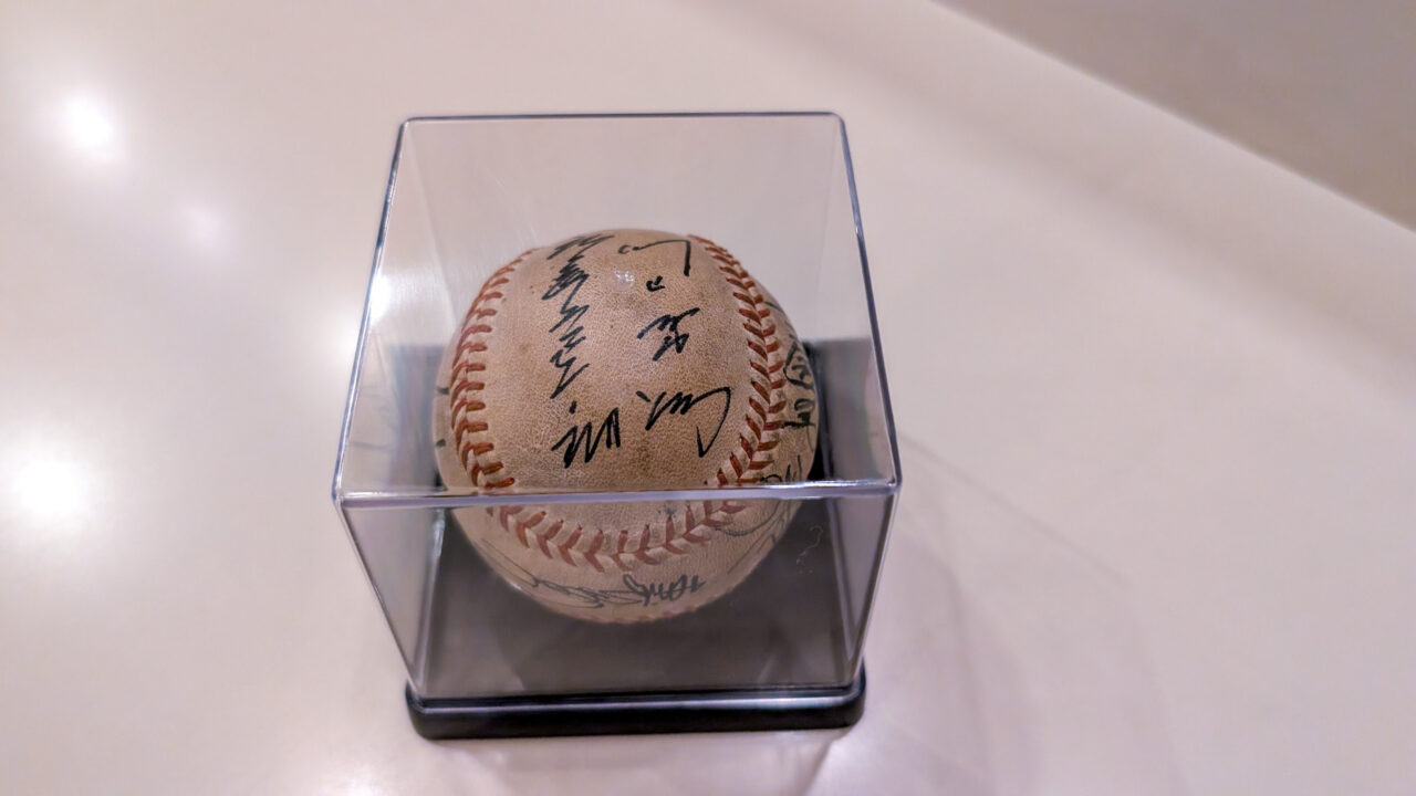 五代目に話を聞くと、四代目が小学生のころ、巨人軍の元選手で引退後はコーチをしていた方の親戚が前川茶舗に修行に来たことがあるそうです。今から60年ほど前のことになるそうで、修行を終えた際にお礼にと言って置いていったのがこの野球ボール。V9当時のものと伝わっているそうです。