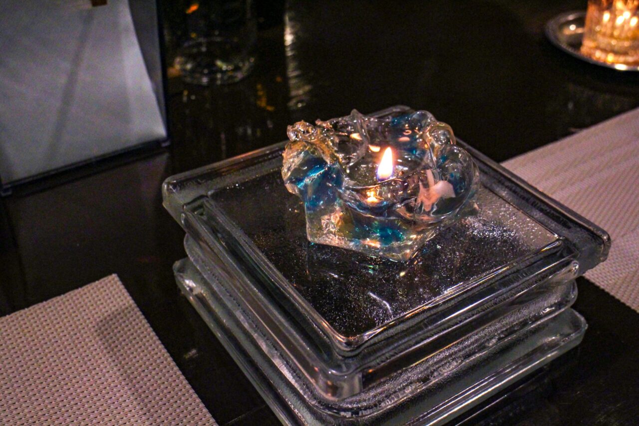 透明なキャンドルも灯っており、お店の雰囲気を引き立てています。偶然にも、キャンドルの作者さんがその場に居合わせていました。富良野の創作キャンドルクリエイター「ゆるもっさ工房」さんの作品で、毎日お店で灯されているそうです。小さな灯りが、その場を優しく包んでいました。