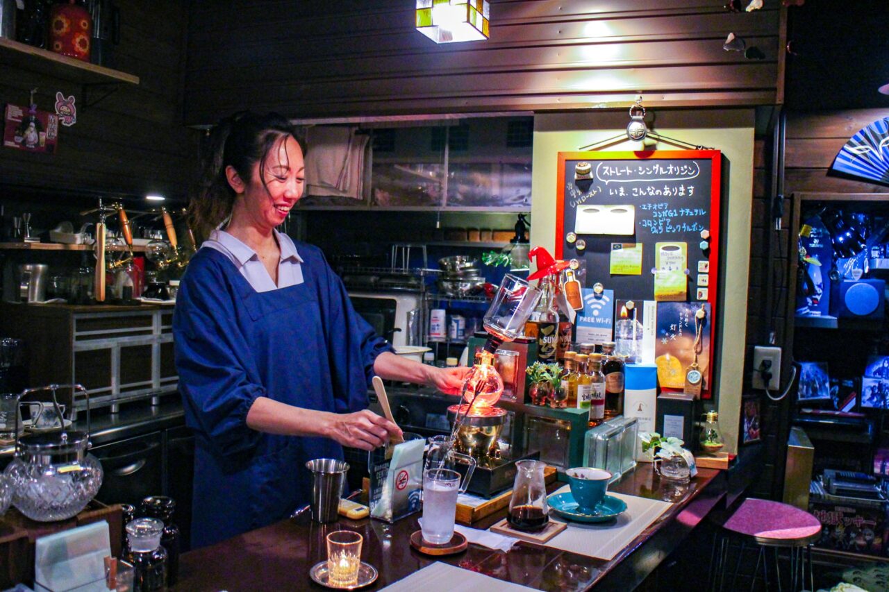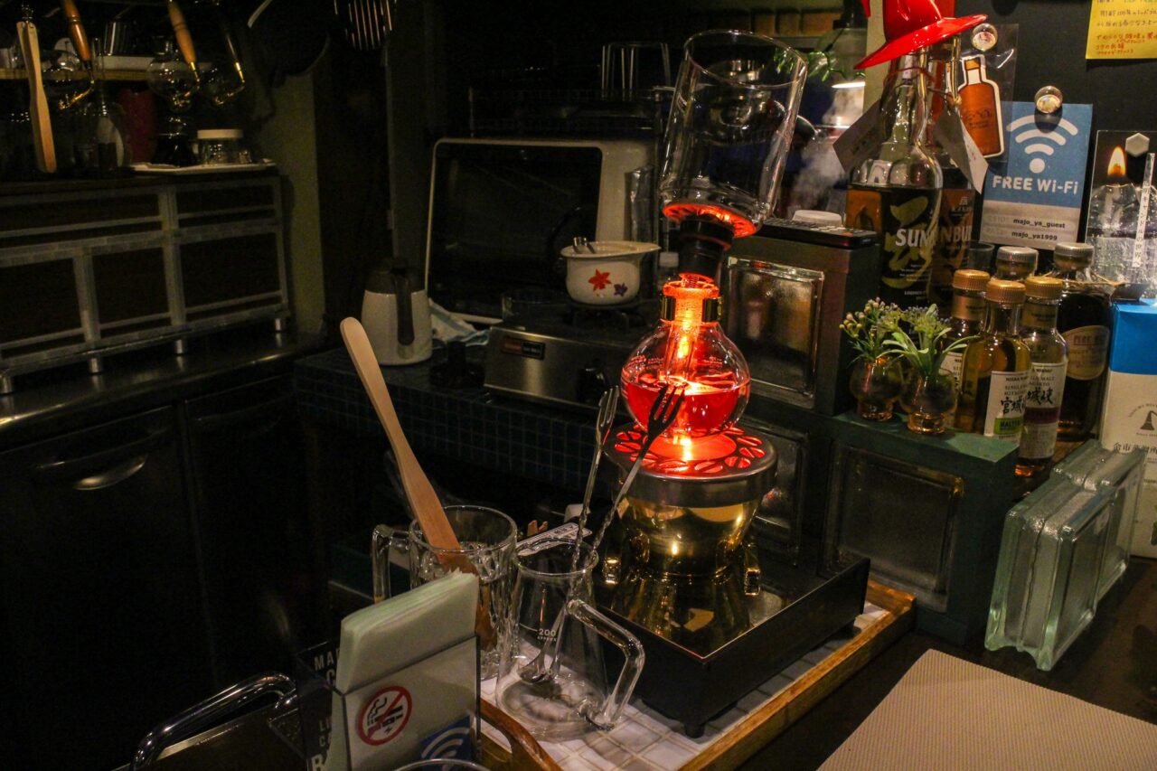 お店の雰囲気にコーヒーサイフォンの色合いはとても良く合っています。珈琲の抽出過程を目で見て楽しむこともできますね。
