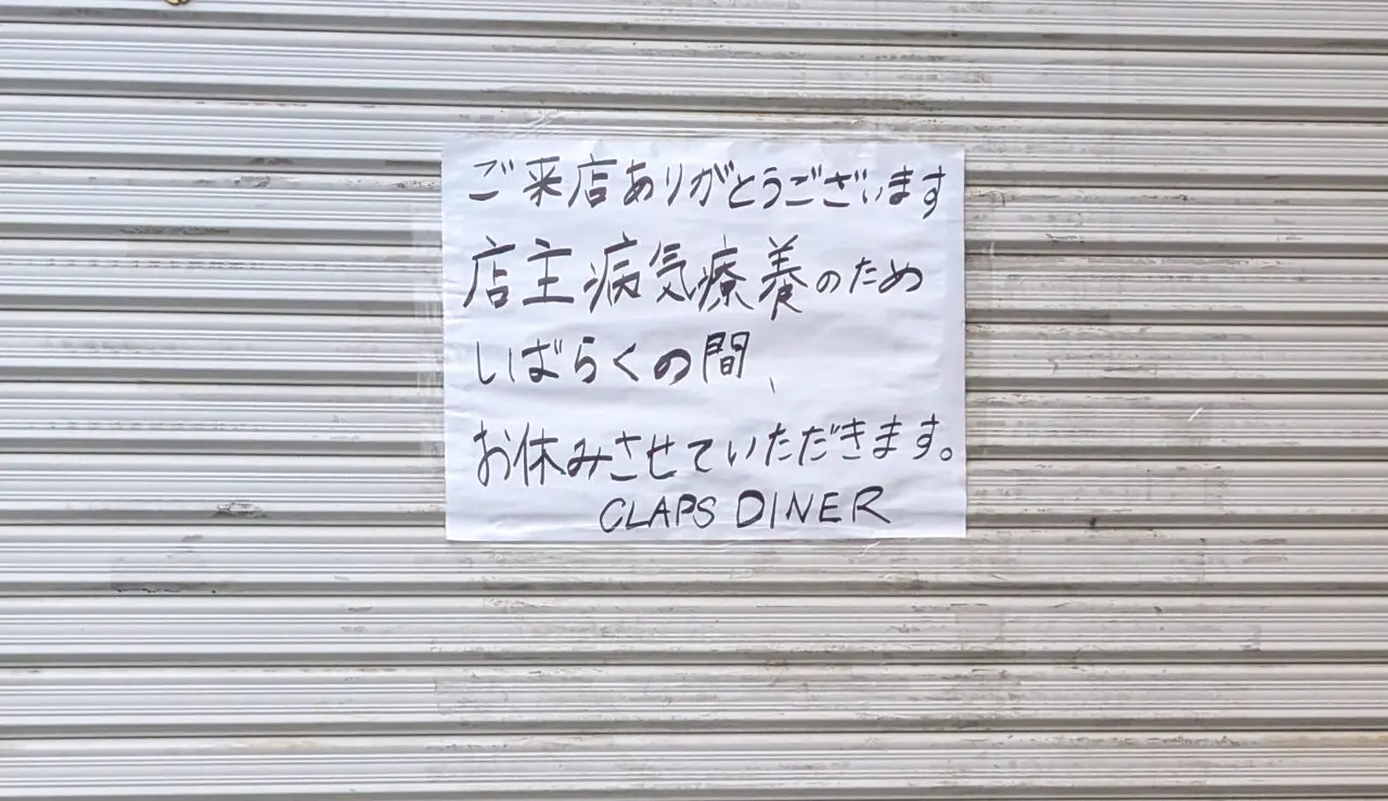 南6条通にある人気のハンバーガー店「CLAPS DINER」を通るたびに、最近は営業時間でも車が駐車しておらず営業をしていない様子であると情報提供がありました。2025年11月中旬になり、お店の前を通ると確かに営業時間内ですが、入口にシャッターが下りていました。