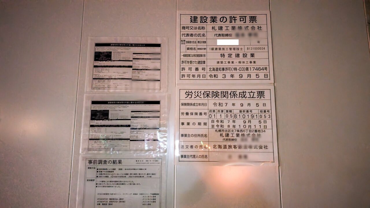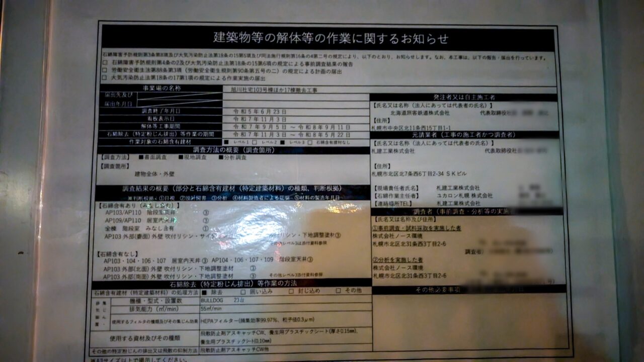 事業の名称は「旭川社宅103号棟ほか17棟撤去工事」とあり、このフェンスで囲まれている建物が解体撤去されるようです。注文者の氏名に「北海道旅客鉄道株式会社」と記載もありました。