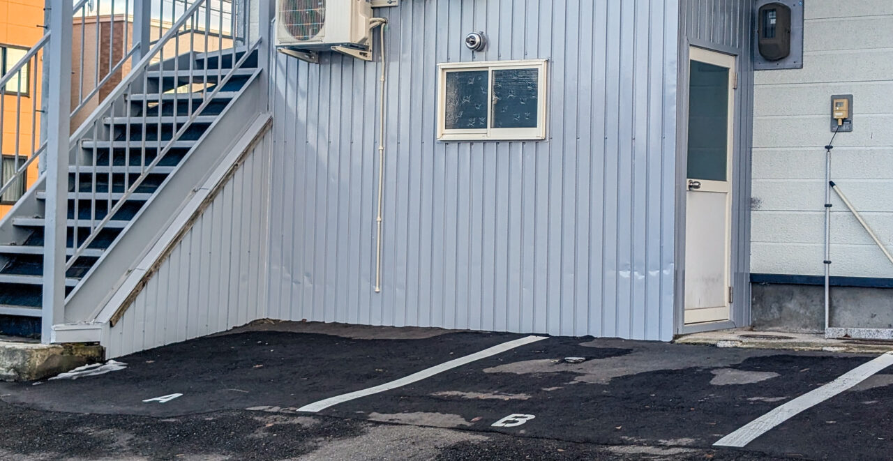 アパートの階段横のAとBと書かれている場所が専用駐車場で、車でも行きやすいお店だと思います。