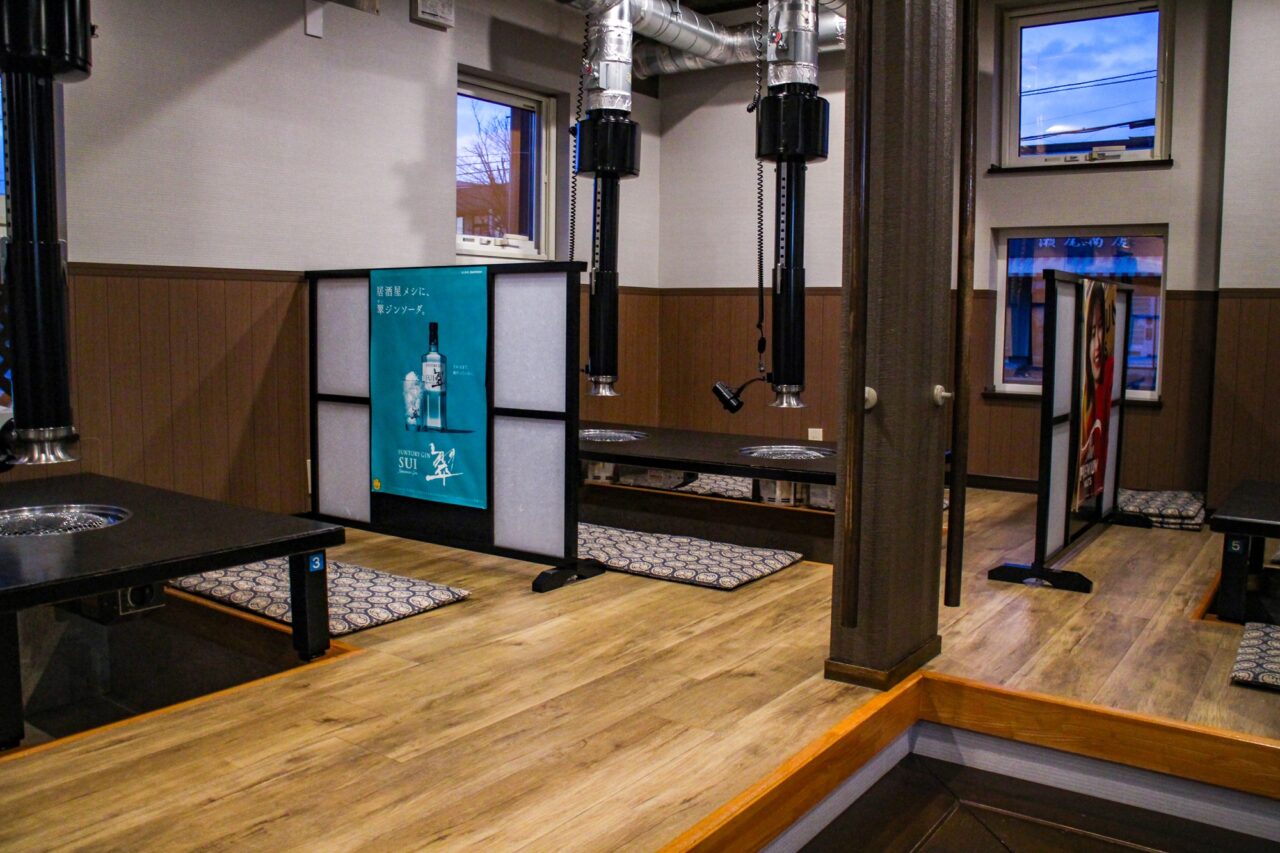 店内は、木目を基調としておりシンプルかつ優しい雰囲気の造りとなっており、小上がりとカウンターが設置されています。小上がりは掘りごたつとなっており、一つ一つのテーブルが広いのでゆっくりくつろいでお肉を味わうことができますね。全席に排煙が設置されており、煙っぽさがほとんど感じられません。清掃も行き届ききれいな店内で、数年前にリニューアルもしているそうです。