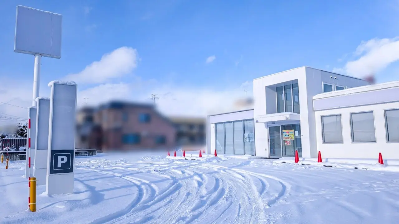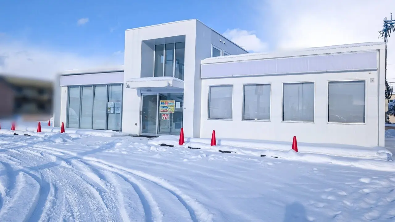 すっかり青空と雪がとても似合う真っ白な建物となりました。この場所は「ドコモショップ あさひまち店」だったのですが、いつの間にか建物やポールサインから看板が外され、ほぼ真っ白の建物となっていました。