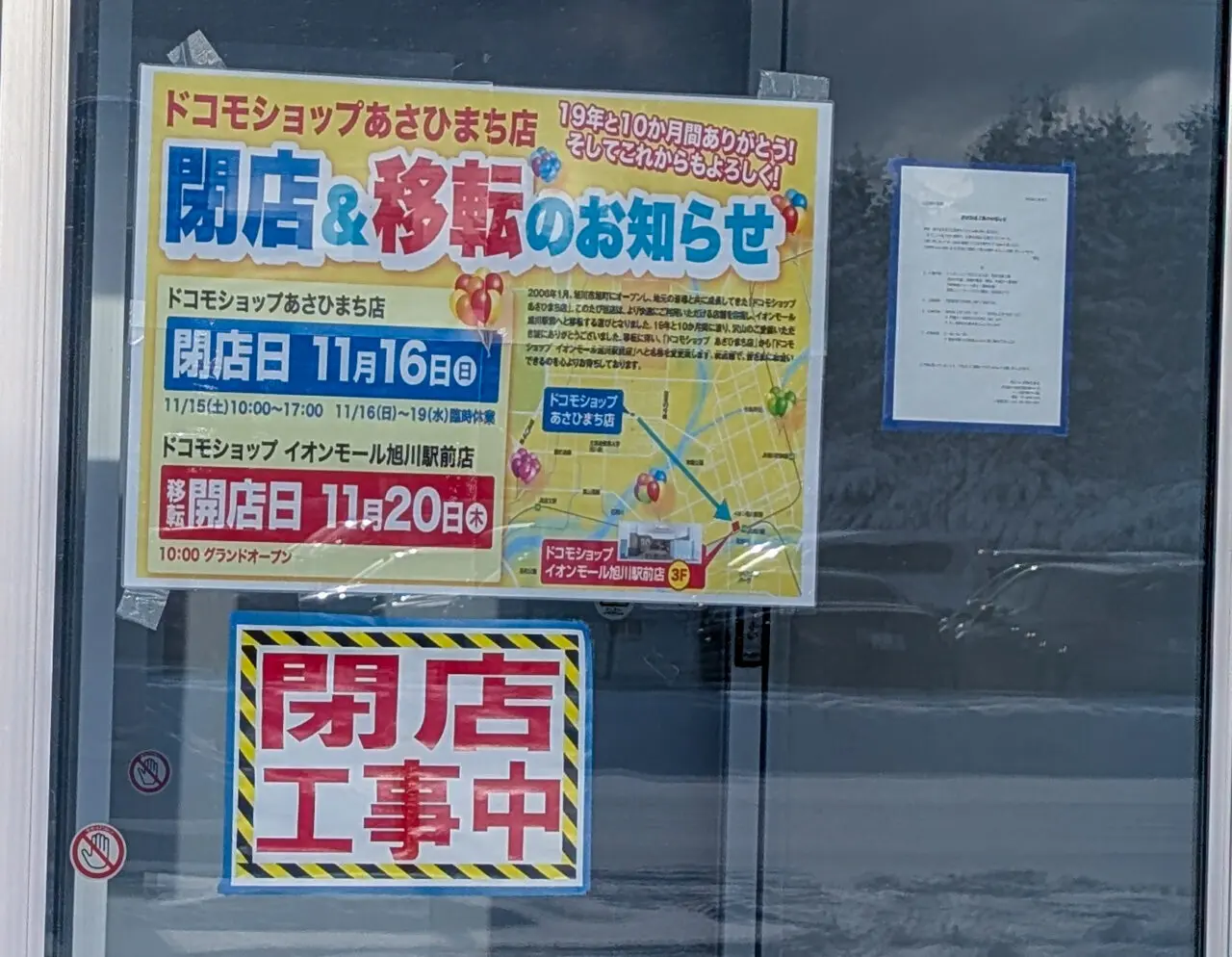 「ドコモショップあさひまち店」は2025年11月16日に閉店し、中心街のイオンモール旭川駅前の店内に「ドコモショップ イオンモール旭川駅前店」として移転し、11月20日にグランドオープンしたとのことです。