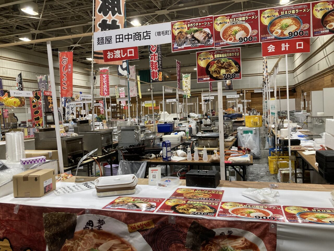 2025年12月21日まであさひかわラーメン村に出店中の増毛町の「麺屋 田中商店」のブースです。おなじみの「甘えびラーメン」から、「酒蔵味噌焼肉焼きそば」も提供するそうです。