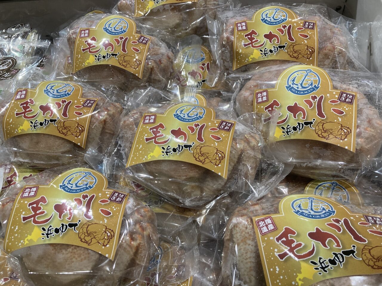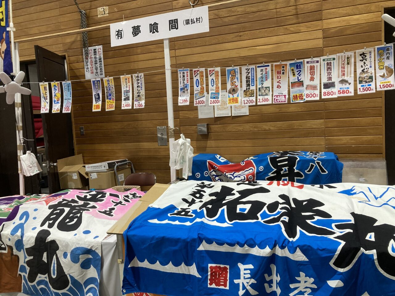 猿払村から出展の「夢喰間」。鮮やかな大漁旗がとても目立っています。販売する商品については後ろに商品名と価格が付けられていますね。それを見ると「大特価」の毛ガニや鮭フィレ、ホタテの貝柱や真ふぐなども販売するようです。年末年始のご馳走を仕入れられるかもしれませんね。
