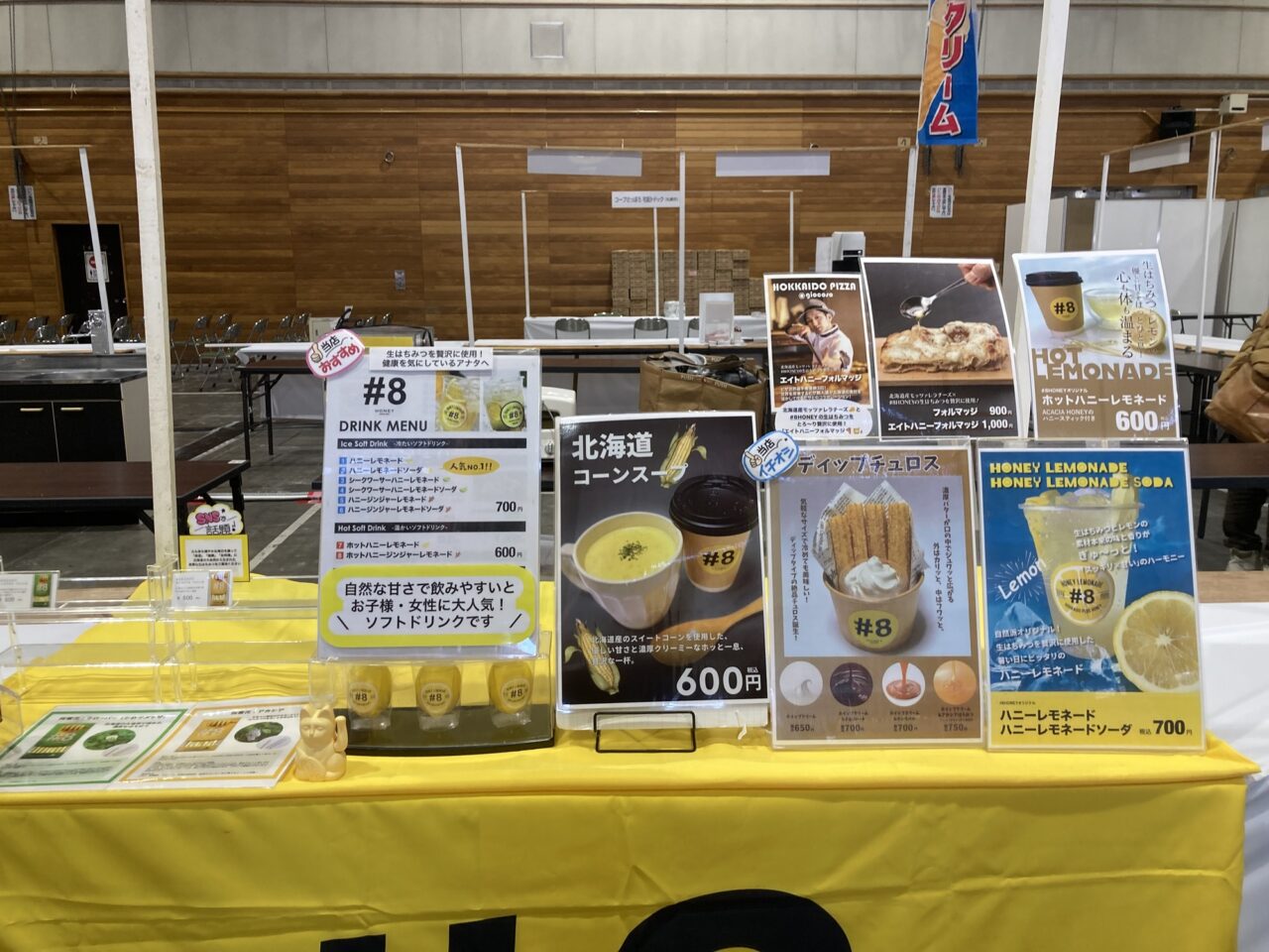 「#8HONEY(エイトハニー)」は、北海道生まれの無添加で安心な生はちみつを使用しています。「ハニーレモネード」などのドリンクを提供します。当日はかなり気温が下がるので「北海道コーンスープ」は外で冷えた身体を温めてくれると思います。