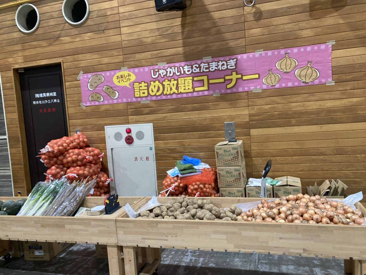 じゃいも&たまねぎの詰め放題コーナーもセッティングが完了しています。大量の玉ねぎが積み重ねられているので、みなさん、上手に詰めていっぱいじゃがいもとたまねぎをゲットしましょう。