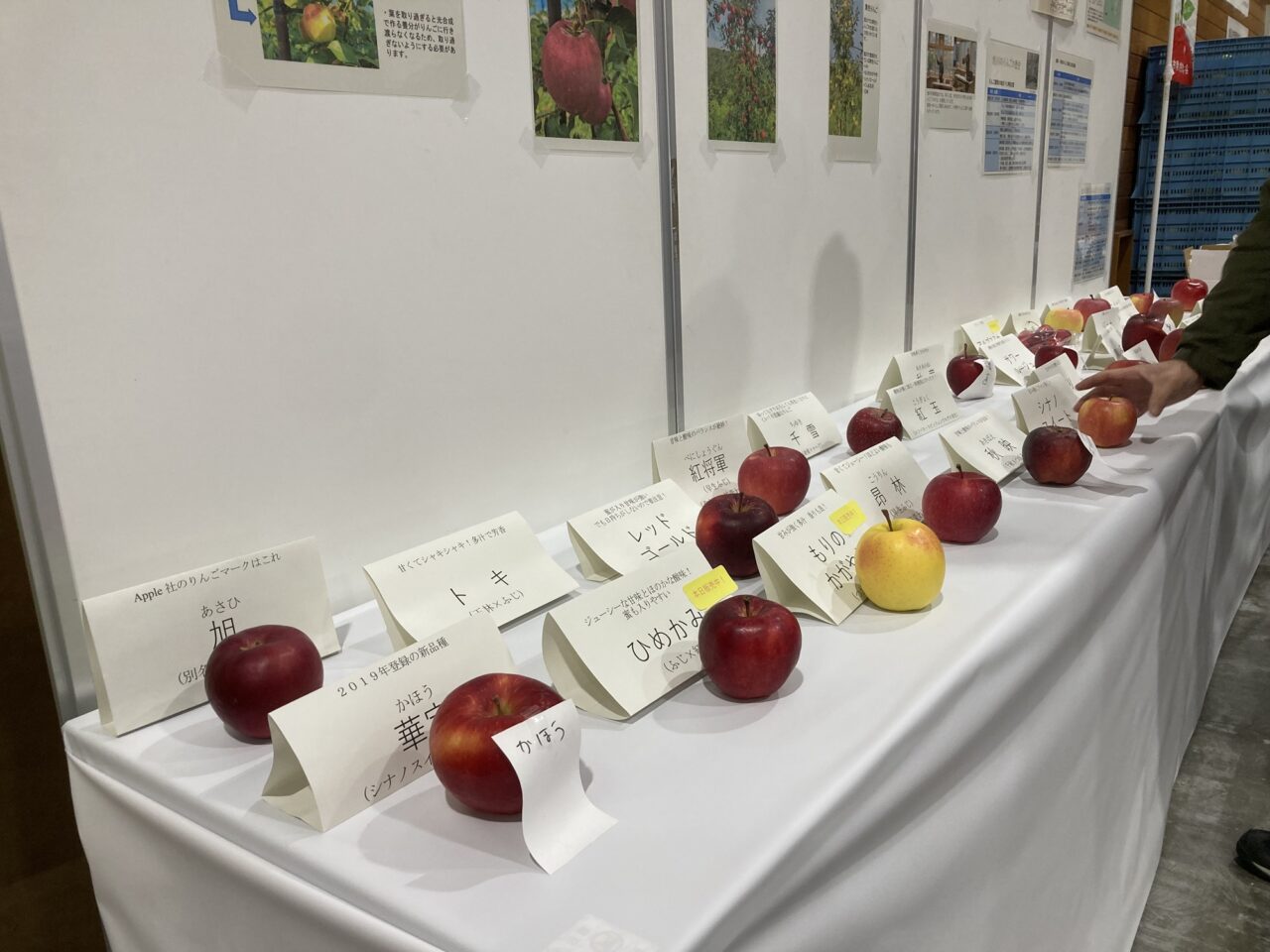 全国のりんごも勢揃い。おなじみのりんごから、新種のりんごが並んでおり、一部の品種は販売もするそうです。どんな特徴があるのかも記載されており、色も形もそれぞれ違うので、ぜひりんご好きさんはご覧くださいね。