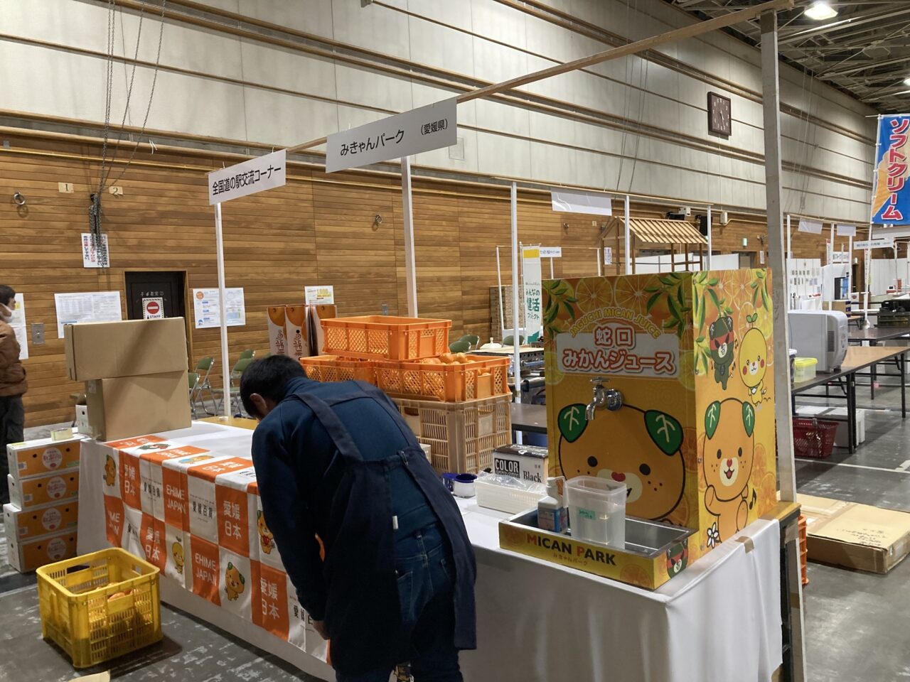 愛媛県から出展の「みきゃんパーク」。話題の「蛇口みかんジュース」がセッティングされています。蛇口をまわすとみかんジュースが出てくるというのは、みかんジュース好きさんには夢のような出来事ですね。ぜひお子さんにも蛇口をまわしてほしいです。