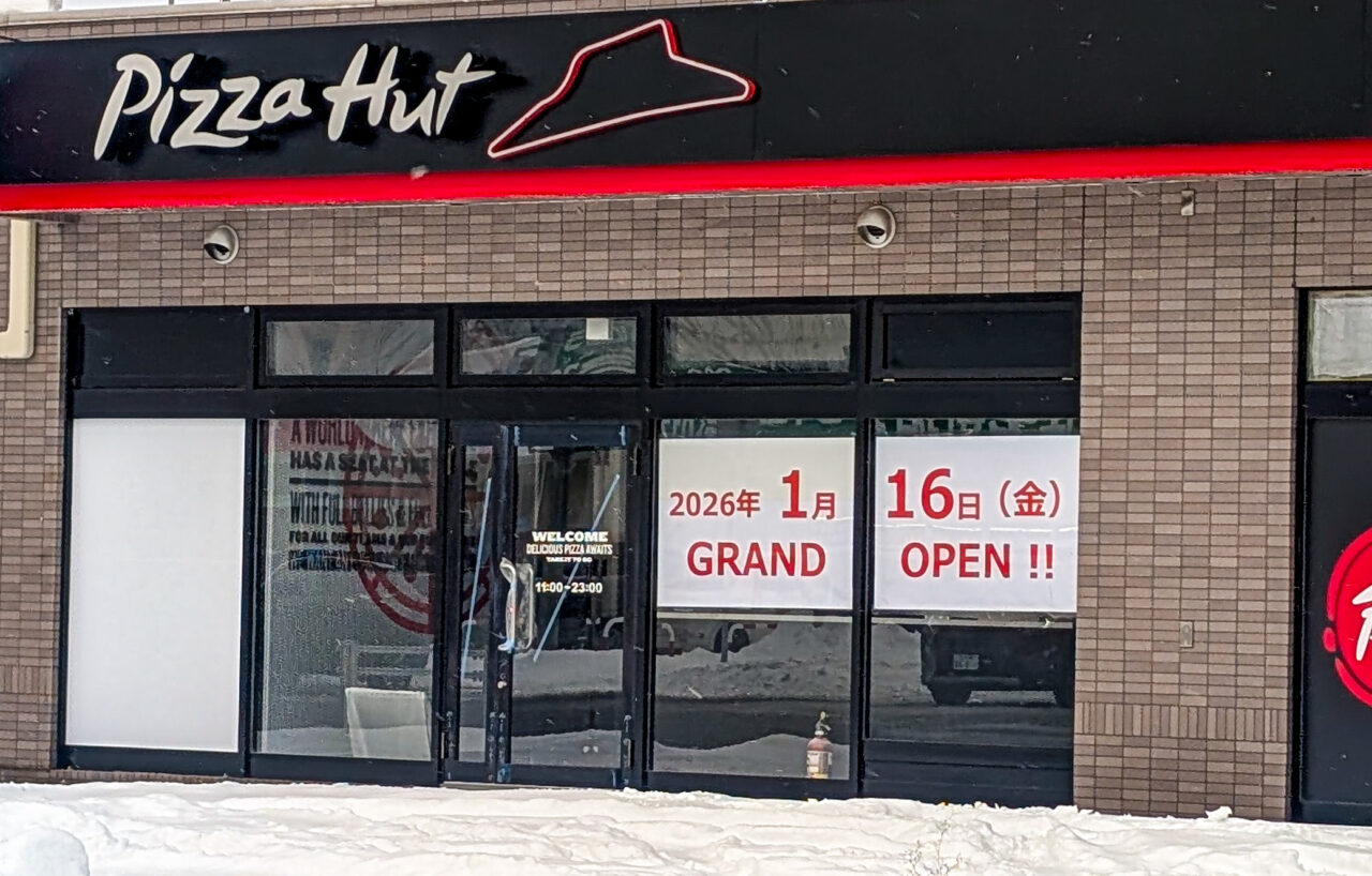 さらに動きがありましたのでお伝えいたします。2025年12月15日にお店の前を通ると、ピザハットの看板の下のガラスに大きく「2026年1月16日(金)GRANDOPEN‼」と記載がありました。