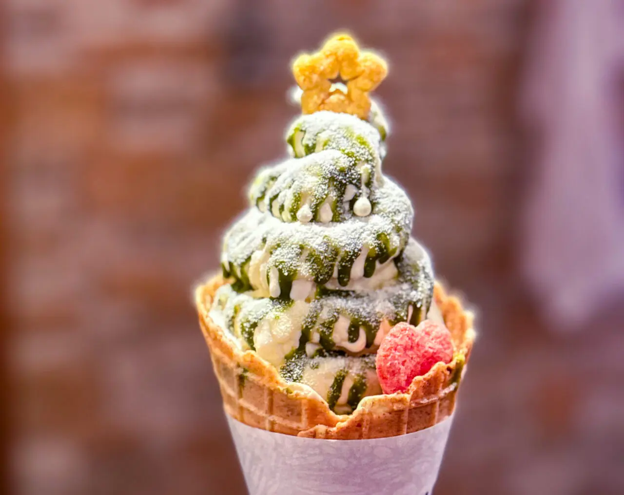 リゲルカフェでは、クリスマスまで限定のかわいいソフトクリームが登場しています。「リゲルのツリーソフト」と言い、ホワイトチョコと抹茶のコーティングソースをダブルでかけ、クリーミーな粉雪パウダーで雪を演出し、いちばん上に付けられたメープル味の星形パフはトップスターを象っています。写真映え抜群のソフトクリームで、コーン・カップどちらも対応しているそうです。