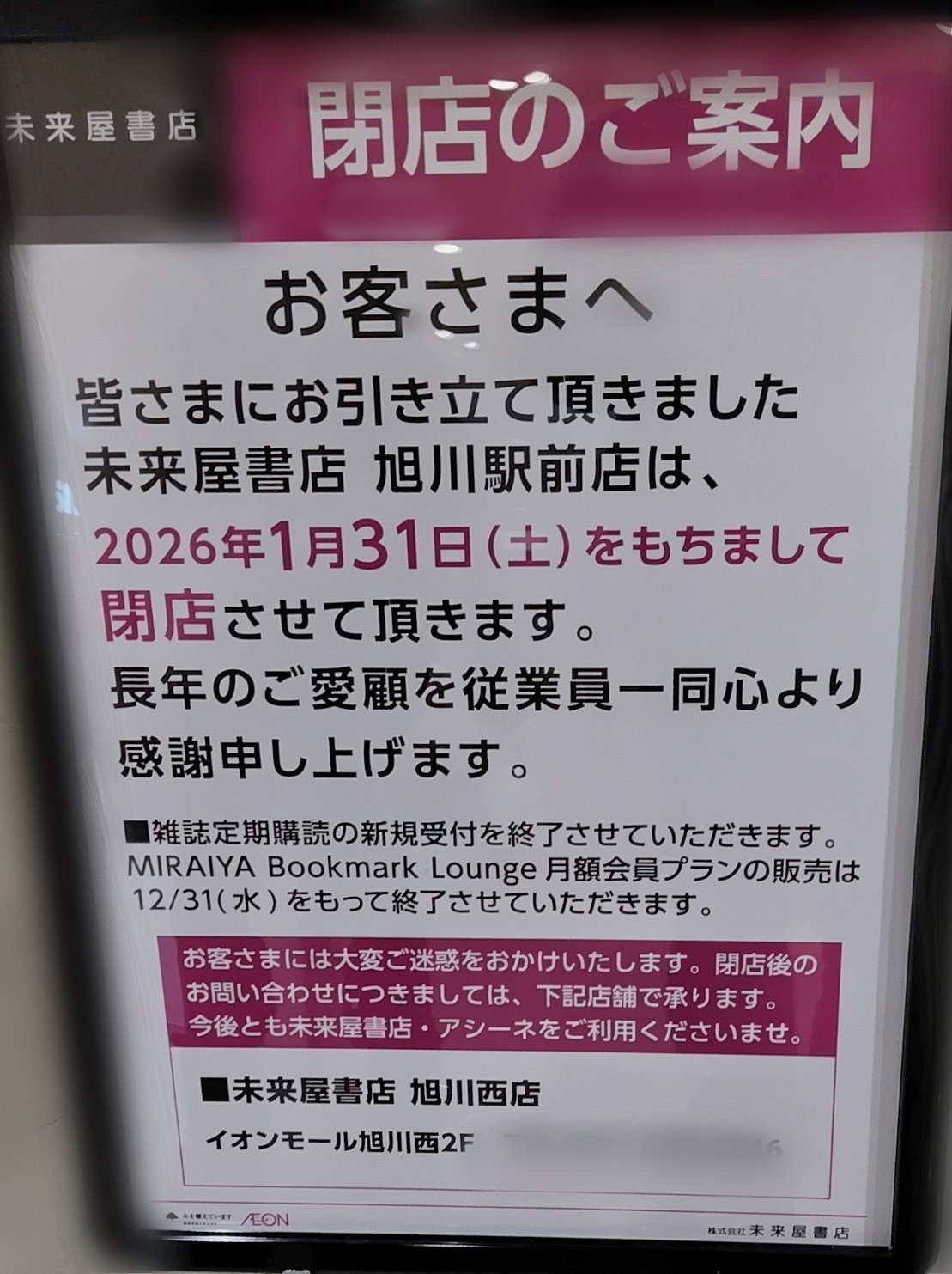 イオンモール旭川駅前の2階にある「未来屋書店旭川駅前店」と「コワーキングスペースMIRAIYA Bookmark Lounge旭川駅前店」が、2026年1月31日をもって閉店することが、お店の公式X(旧Twitter)より分かりました。
