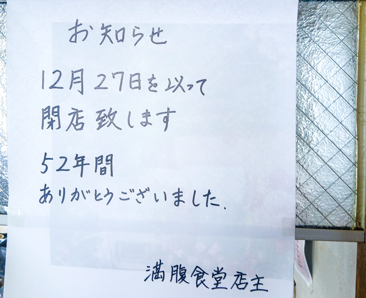 その「満腹食堂」が、多くの人に惜しまれながら2025年12月27日をもって営業を終了しました。閉店の情報が駆け巡ってから、連日多くの人が駆けつけたとのことです。かつて東高に通っていた人や、常連さんたち、懐かしんで訪ねて来る人など多くの人に囲まれ、とても賑やかな店内だったと、来店したみなさんが話していました。