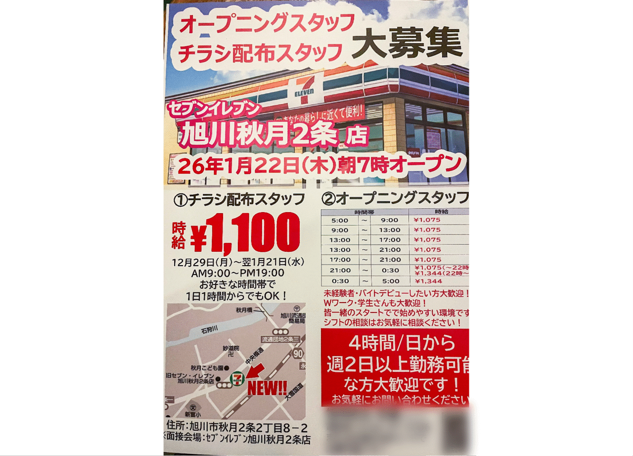「オープニングスタッフ大募集」のチラシを見ると、「セブン-イレブン旭川秋月2条店」が2026年1月22日(木)朝7時にオープン予定であることが分かりました。中央橋通を車で通るたびにどんな建物ができるのかと楽しみにしてきた人も多くいるかと思います。すぐ近くに「セブン-イレブン 旭川秋月2条店」があるのですが、そちらはチラシの地図に「旧旭川秋月2条店」と記載されています。