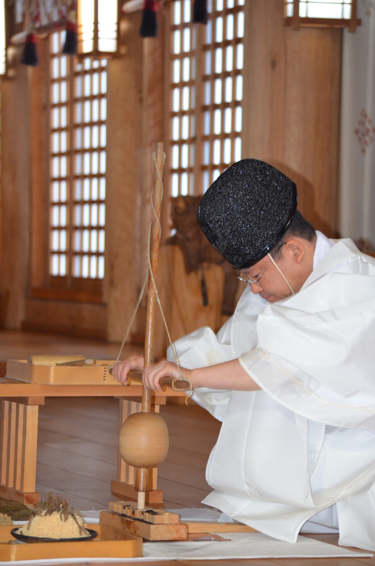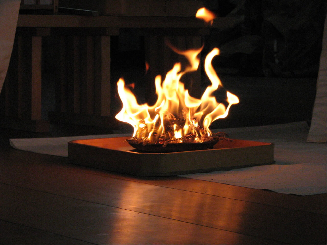 上川神社のどんど焼きでは、まずどんど焼きの前日に「火鑚(ひきり)神事」が行われます。火鑚(ひきり)とは、古来からの火おこしの方法で、木と木をこすり合わせて火を起こすことです。現在でも伊勢神宮をはじめ全国各社で火鑚(ひきり)は行われているそうですが、上川神社の火鑚(ひきり)道具は、特別のご配慮により伊勢神宮から頂いたものなんだそうですよ。