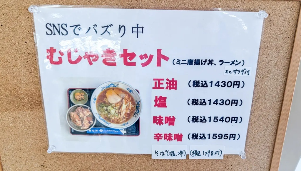 2025年に、SNSで「むじゃきセット」がバズりとても話題となりました。むじゃきセットとはラーメン(またはそば)、からあげにライスとサラダのセットで、ボリューム満点であり、それぞれの一品の満足度が高いことからも大人気のセットです。