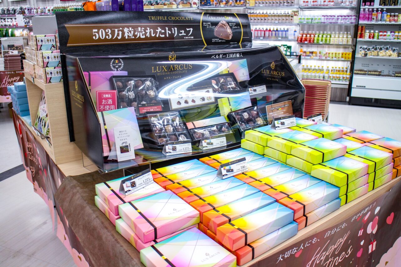 昨年はバレンタイン前には完売したLUX ARCUS (ルクス・アルクス)の「503万粒売れたトリュフ」は、本場ベルギーのショコラティエたちの技術と感性が詰まったチョコレートだそうです。種類も多くあり、トリュフながら比較的お求めやすい価格であることも特徴です。こだわりの3層構造となっており、口どけなめらかなエアーインガナッシュをチョコレートコーティングし、表面はフレークチョコレートとなっています。なめらかな口どけが人気の秘訣というトリュフは、入荷時は山積みとなっていたのですが、すでにかなりの売れ行きで、在庫は現品限りだそうです。