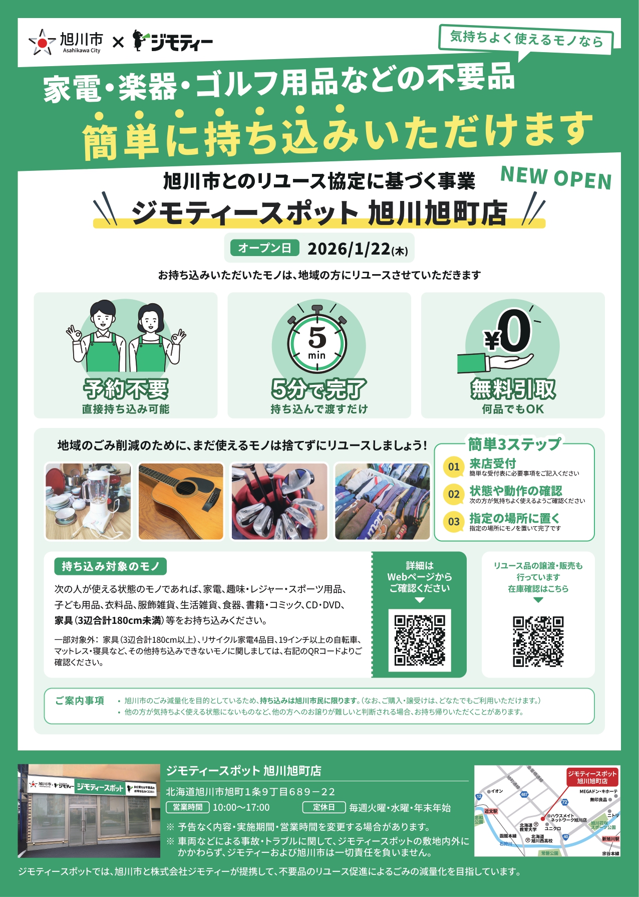 ジモティースポットとは、「まだ使えるけれど不要になったモノ」を地域内で譲り合うことが出来るサービスです。不要品を譲りたい方は、予約なしで持ち込むだけで、次に必要とする方へつなぐことができ、譲り受けたい方は、地域の情報サイト「ジモティー」で商品情報を確認した後、店舗で実物を見て購入・引き取りができるという仕組みとなっています。また持ち込みできるのは、旭川市民のみとなっており、身分証の持参が必要です。