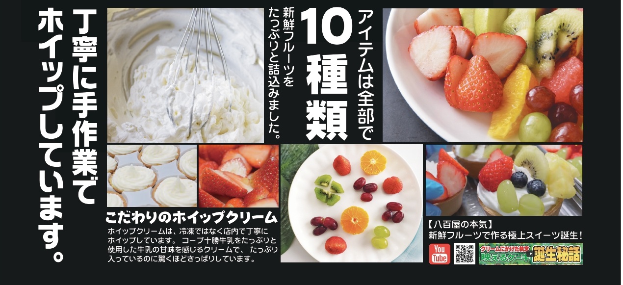 農産部が本気で製作したスイーツとのことで、全部で10種類。すべてに新鮮なフルーツをたっぷり詰め込んでいます。ホイップも店内で丁寧に手作業で作っている「こだわりのホイップクリーム」で、コープ十勝牛乳を使用しており、牛乳の甘みを感じつつも驚くほどさっぱりとしているそうです。