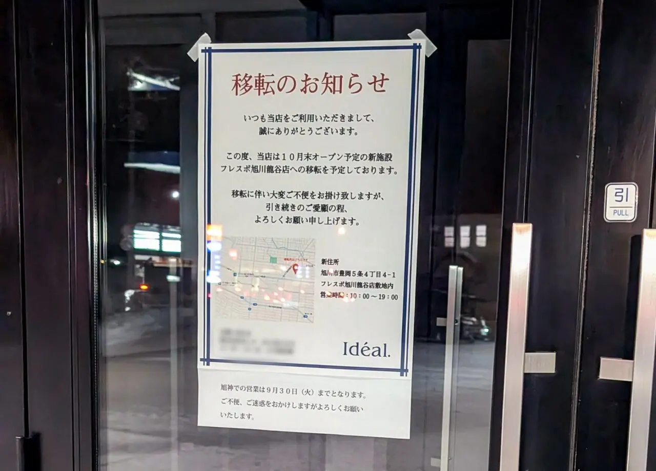 「業務スーパー 旭神店」のすぐ近くにあった「Idéal.旭川店」も豊岡のフレスポ旭川龍谷に移転し、2025年10月30日にオープンしています。跡地は「移転のお知らせ」が貼られたままで、まだ動きが見られません。