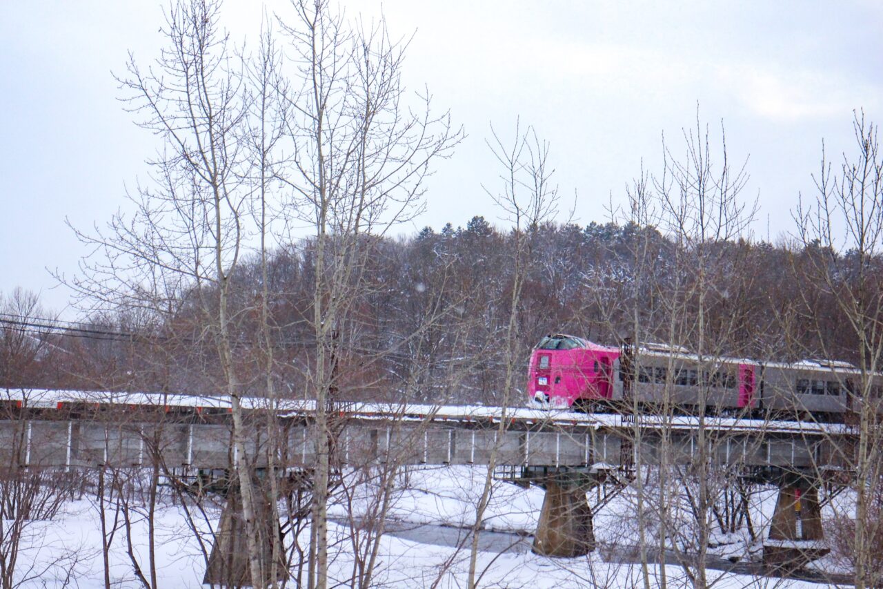 他にも「はまなす」編成の列車が見られる日があります。札幌~函館間を走る特急北斗が、261系5000代「はまなす」編成での運転列車および運転日が決まっており、2月6日~11日、14日~23日まで札幌7:43発・函館11:54着の特急北斗84号と、函館13:00発・札幌17:00着の特急北斗91号が「はまなす編成」となります。旭川では見られませんが、もし札幌方面や函館方面に行かれる予定の方は、雪の中を走る「はまなす号」をぜひご覧ください。
