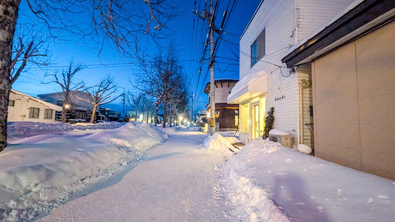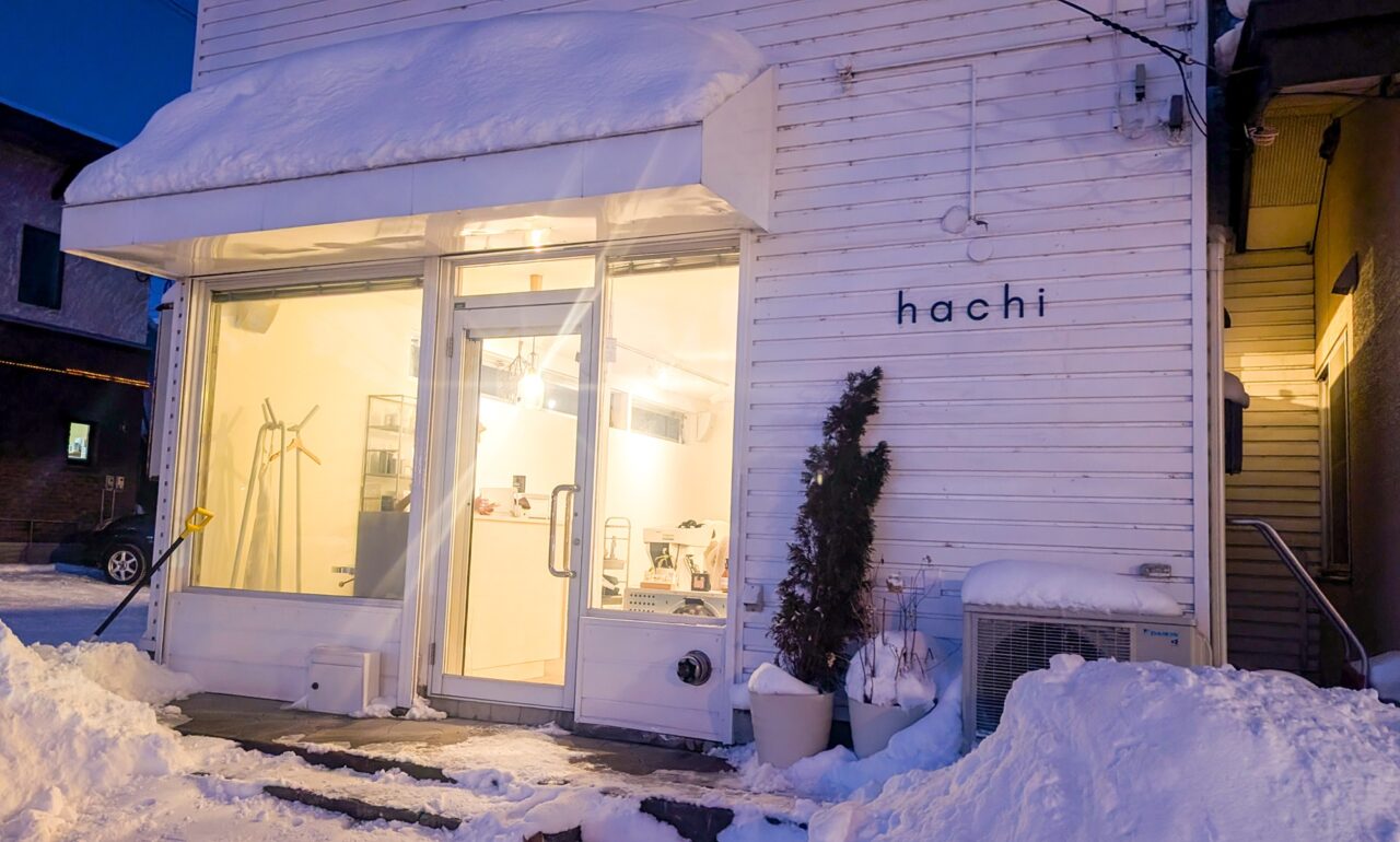 白い建物が冬の雪に映える緑が丘にある「hachi」。店名のみ記載されているので、行き交う人は「なんのお店だろう?」と、そっとうかがう人も多いそうです。