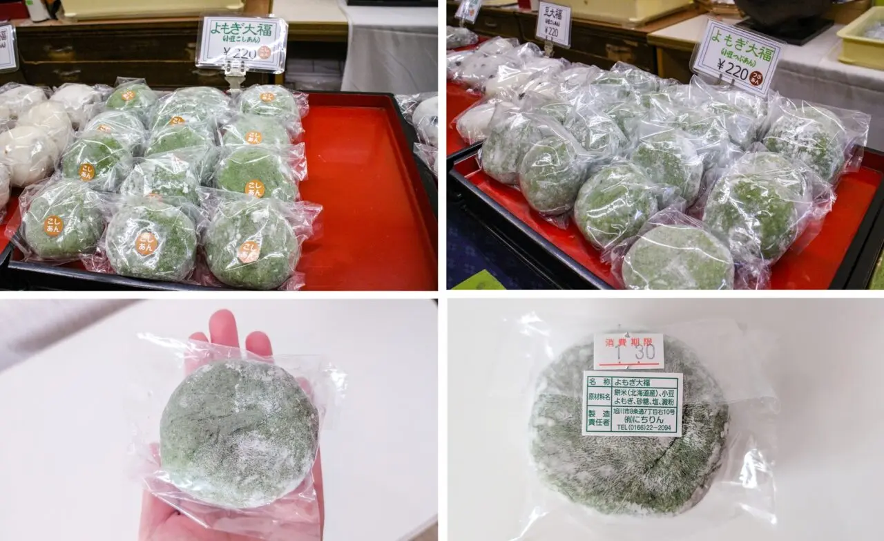 創業当時から引き継いでいる和菓子は多くありますが、中でも「よもぎ大福」は旭川産の天然よもぎを100%使用している、旭川ならではの逸品です。材料には北海道産のもち米、小豆、よもぎ、砂糖、塩、澱粉といたってシンプルな材料で作られている無添加の大福です。あんこはお店自家製のオリジナルのものを毎日手作りしています。