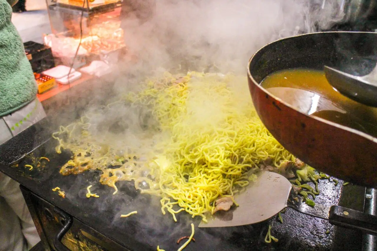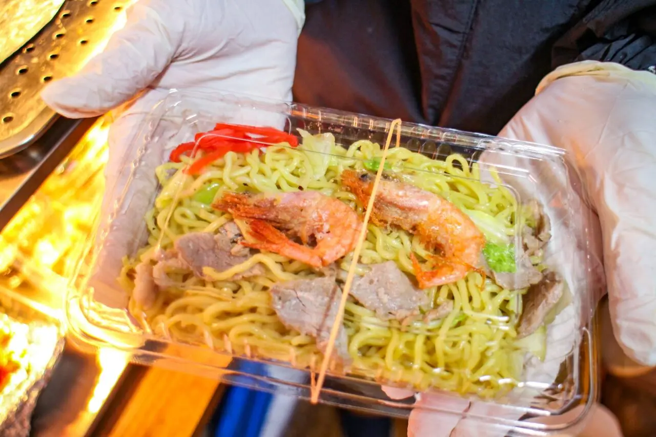 湯気をあげながら鉄板で調理しているのは「甘えび塩焼きそば」です。焼きながら、麺にも甘えびの出汁を注いでいるので、えびの風味が焼きそばから香ります。