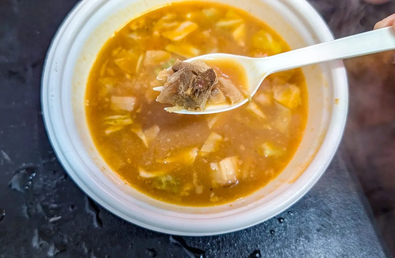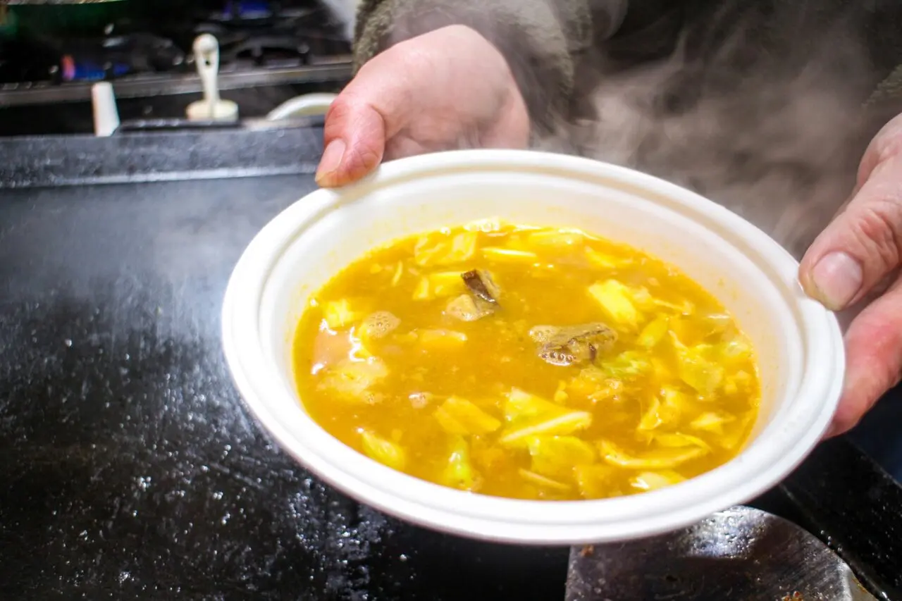 甘えびから取った出汁で作られているスープは甘えびの風味はもちろん、サイコロチャーシューが想像以上にゴロゴロと何個も入っており、キャベツの甘味も感じられました。凍えているとき身体を温めるメニューとして最適だと思います。「甘えび旨辛担々スープ」も提供しています。どちらもボリュームがあって500円(税込)というお手頃価格です。