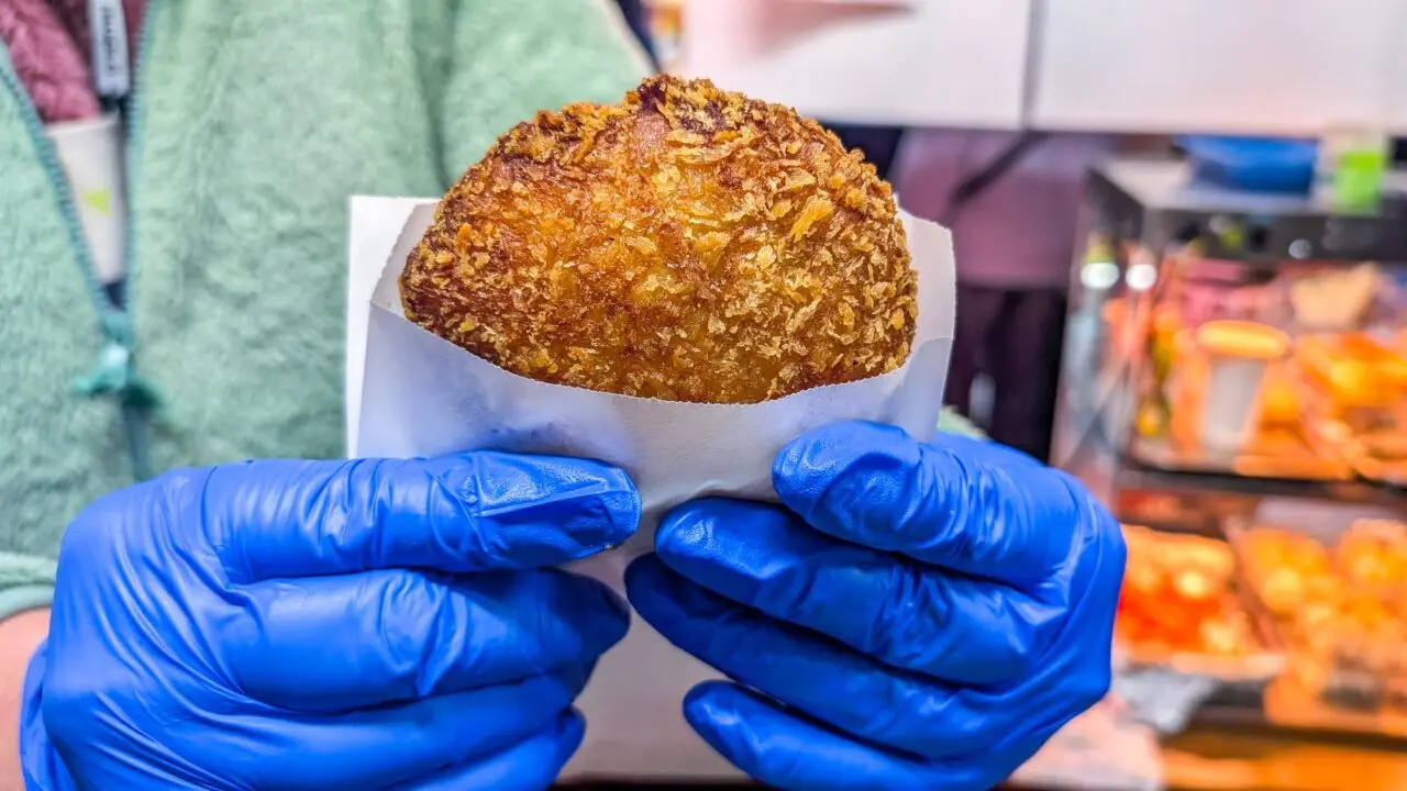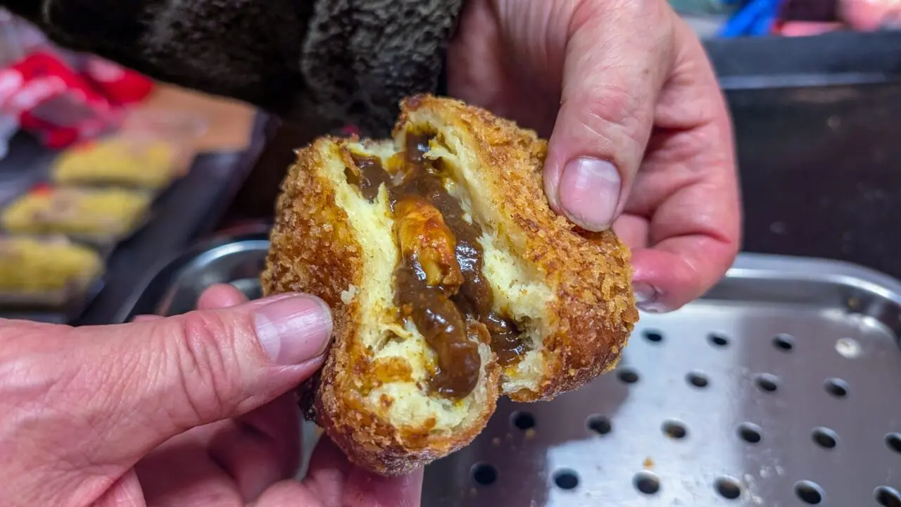 店主さんにカレーパンを2つに割っていただきました。二度揚げしているので、中まで熱々であり、表面はサクサクとしています。スパイシーなカレーに仕上がっていますが、子どもから高齢者のみなさんも味わえる味付けに調整しており、万人受けするえびの風味が濃いカレーパンです。価格は500円(税込)です。