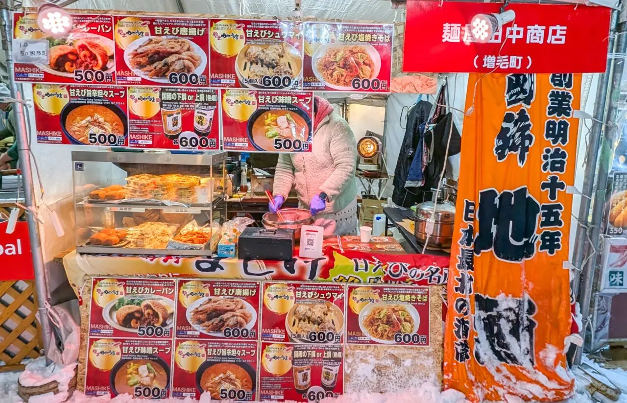 旭川でも食べマルシェやラーメン村キャラバン、冬の地場産フェアなどにも出店しておりお馴染みとなっているラーメン店ですが、今回の冬まつりにはラーメンの提供はなく、ラーメン以外の甘えび商品が登場しているんです。メニューを詳しくご案内します。