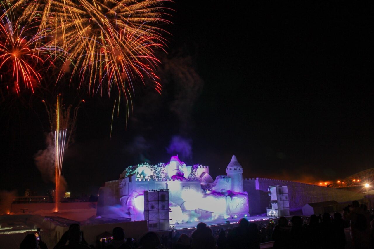 この場所だと高さもあることから、花火が大雪像の上に打ち上げられ、大雪像と花火のコラボを楽しむことができます。また大雪像もライトアップされ、いろいろな彩りを楽しむことができ、大迫力の花火のショーを楽しむのはこの場所が一番かと思います。