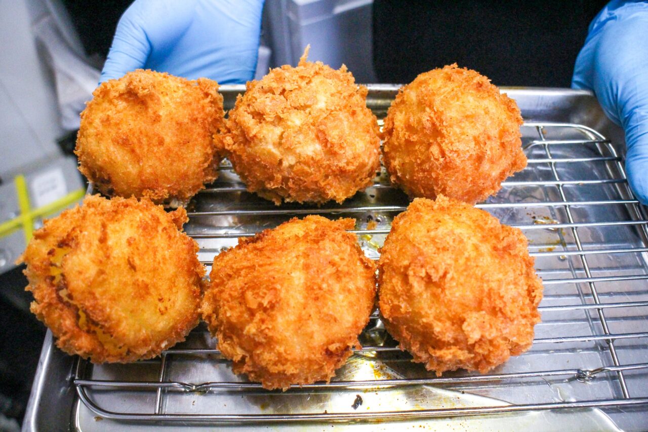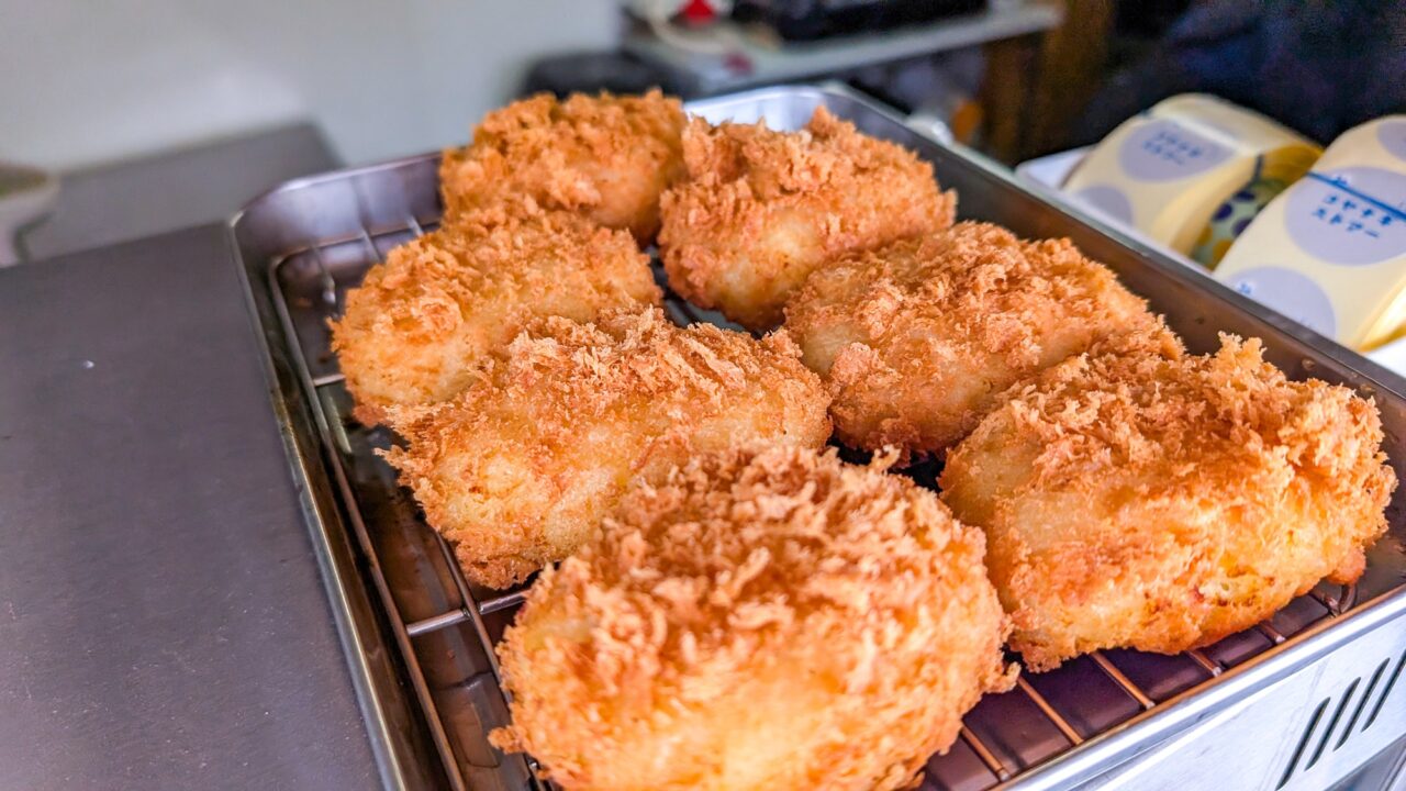 一番人気はじゃがいもとチーズの相性抜群の「チーズコロッケ」で、熱々で味わうとチーズがとろ~りとしています。一個一個にボリュームもあり、飽きがこないオーソドックスな庶民派のコロッケという印象で、この物価高の時代にすべての種類を一個100円(税込)で提供しているのも嬉しいですね。コロッケは人気ですぐに完売してしまう日もあります。水曜と土曜は数を多く提供しているとのことで、ゲットしやすいと思います。