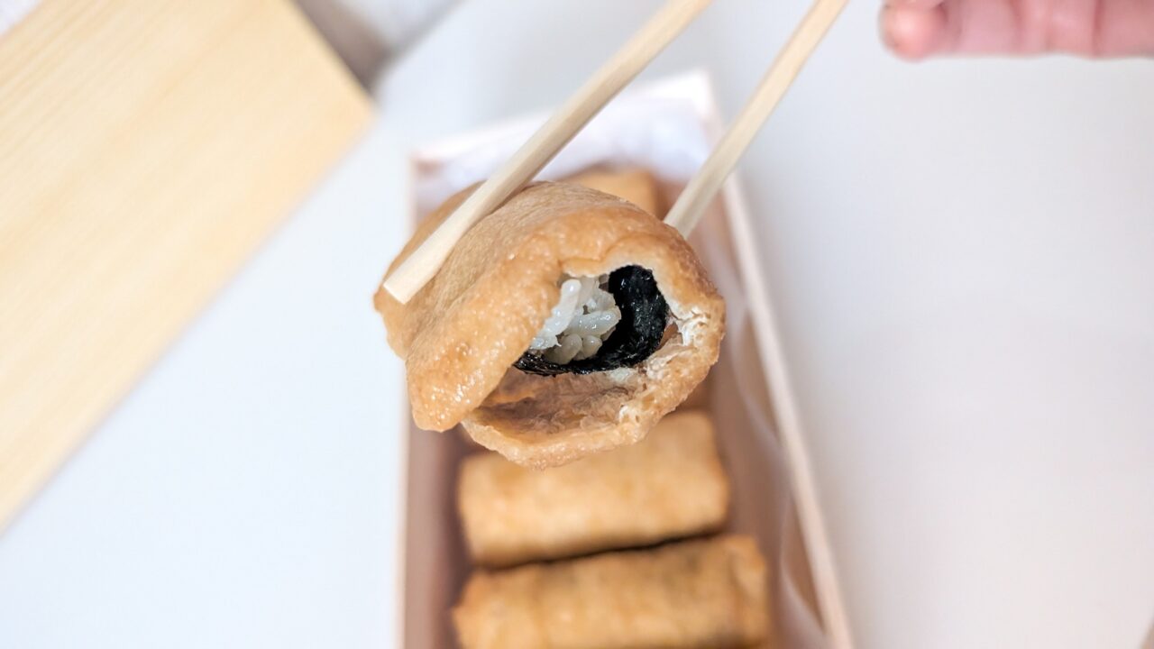 お店のいなり寿司は、甘さで食べる従来のいなり寿司ではなく、だしと赤酢の旨みで味わうものだそうです。「信田巻き」という巻き方をしているのも特徴で、袋に詰める形とは違って、揚げで酢飯を巻いています。揚げの表面積が増える分、だしの旨みが外側にも行き渡り、一口目でじゅわっとだしが口の中いっぱいに染みわたり、上品な和食ならではの風味を存分に味わうことができると思います。