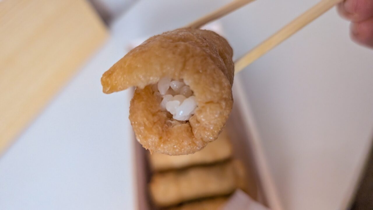 かわいらしいサイズの稲荷寿司が、全部で七つ入っていました。油揚げにだしが染み込み、赤酢の酢飯は酢ならではのツーンとなることはなく、まろやかな酸味の優しい味わいとなっています。酢飯の量は多くはないものの、だし染みる油揚げと酢飯のバランスの良いいなり寿司でした。
