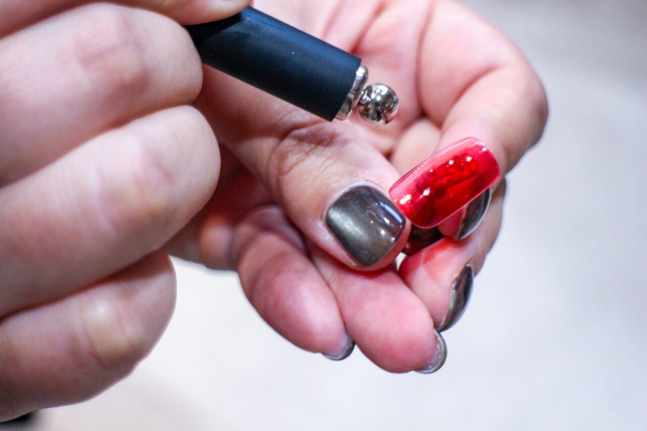マグネットネイルとは、微細な鉄粉を含んだ専用のジェルやポリッシュを塗布し、マグネット(磁石)を近づけて模様を作るネイルアートのことだそうです。今回はシンプルで光の加減で色合いも変わる奥行あるマグネットネイルを実際に見せていただきました。