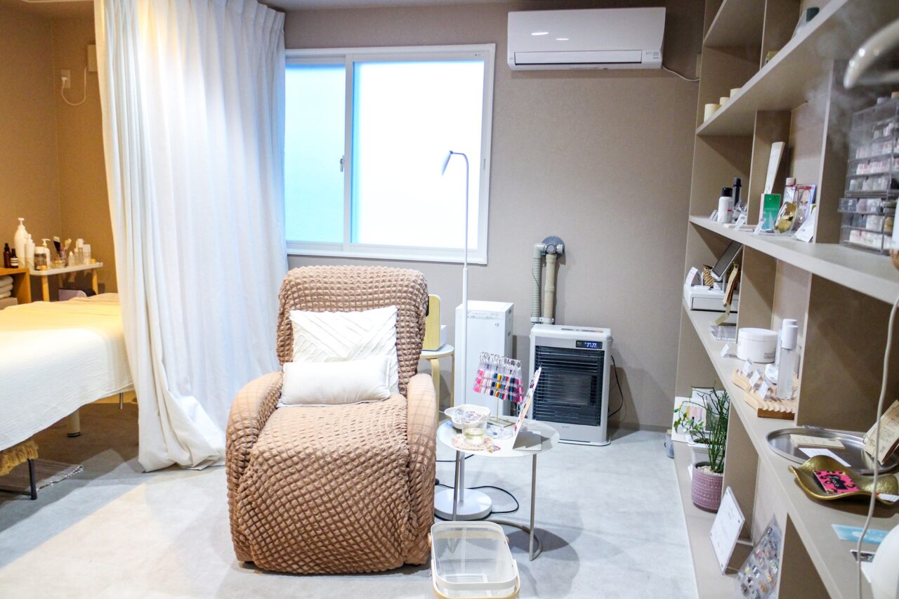 2024年12月にオープンした「the era」では、ネイルとフェイシャルエステの施術を受けることができます。店内はナチュラルな空間となっており、居心地もとても良く、優しい雰囲気です。店内へはスリッパに履き替えて入店となります。