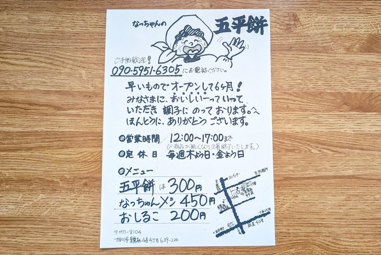 「おやきの冨士屋」の親戚にあたるお店「なっちゃんの五平餅」は、東鷹栖の住宅街にあります。2025年9月にオープンしたお店で、なんと店主さんは70代。笑顔がとってもかわいい「なっちゃん」は、祖母が作ってくれた五平餅を旭川の皆さんに味わってほしいという思いと、多くの人と触れ合いたいと感じ、お店をはじめました。
