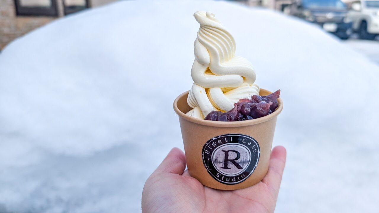 クネクネソフトたっぷりのカップにあんこがたっぷり添えられています。SとMのカップと、プラス白玉入りのサンデーを提供予定だそうです。「福の神」とはとても縁起が良いネーミングですね。写真はSカップですが、かなりのボリュームがあり、思わず「これで本当にSサイズ?」とつぶやいてしまいました。今の時期だと雪の白さにも映えるソフトクリームです。
