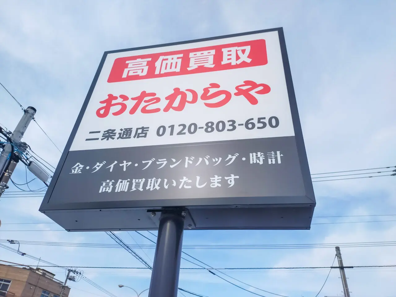2月25日に確認したところ、すでにお店には看板が設置されており「おたからや 二条通店」と店名も表示されていました。ドミノ・ピザの跡地は、買取専門店に生まれ変わるようです。
