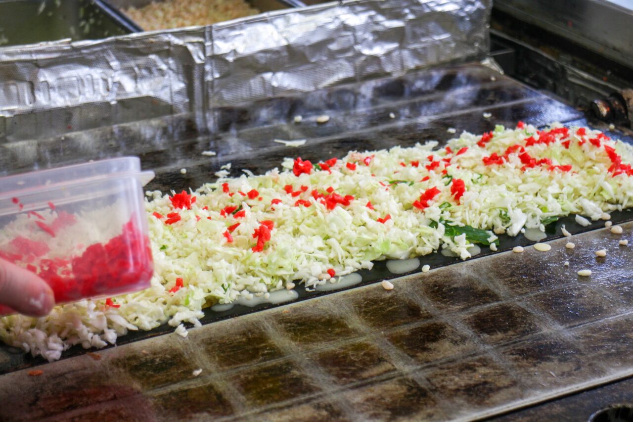 「おやきの冨士屋」のたこ焼きの特徴は、キャベツや生姜などがいっぱい入っており、食べていると甘味が感じられるところです。またくるくる回して焼くタイプではなく、じっくりと鉄板を重ねて20分ほど焼いています。