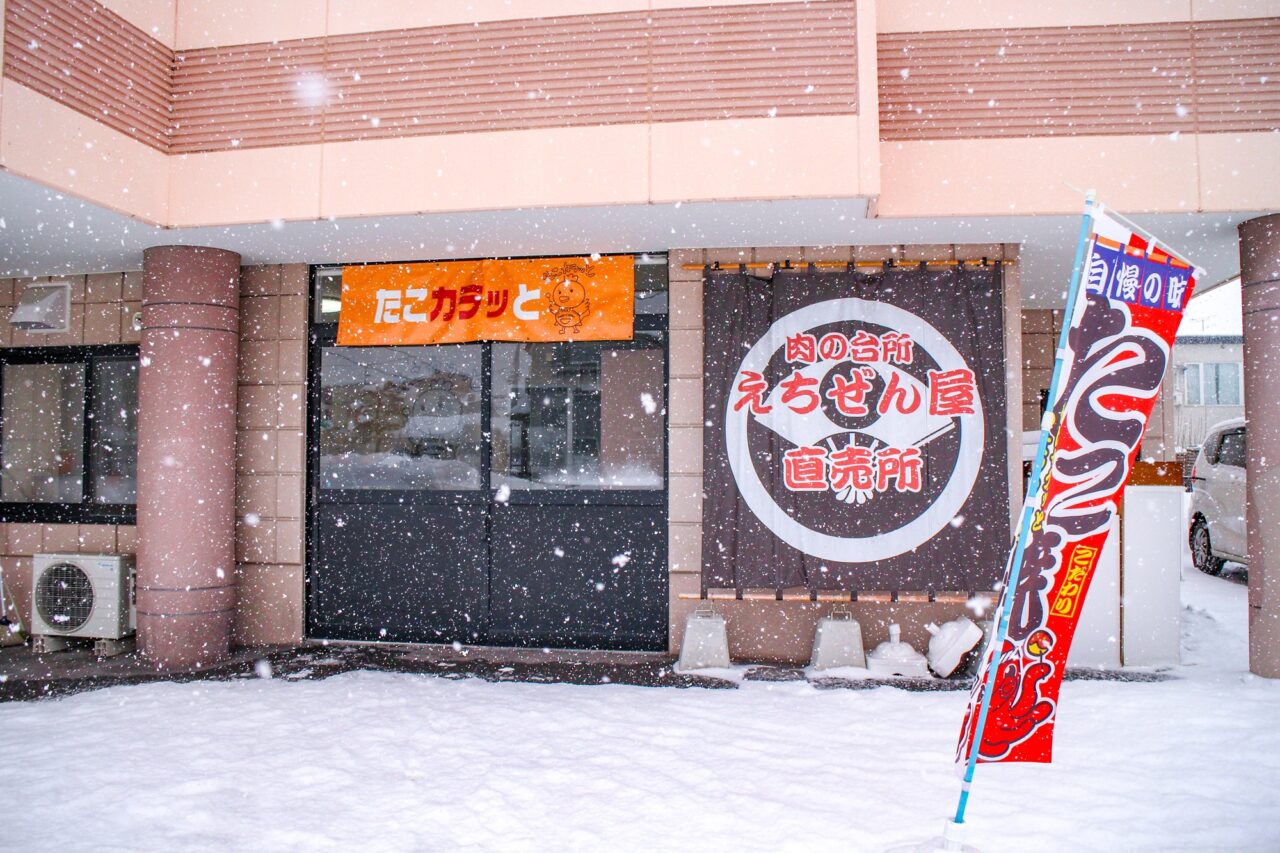 南1条通の「北の台所 えちぜん屋」に併設している「たこカラッと」は、普通の爪楊枝では持ち上げられない一個一個のたこ焼きがとても大きく、ふわとろ食感が特徴です。たこ焼きとからあげメインのお店となります。