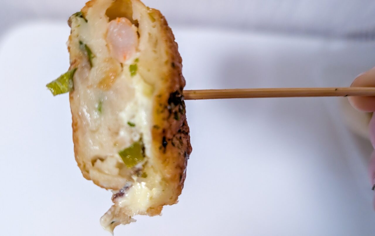 今でも一口茶屋ではじめて「えびマヨ」を味わった日の驚きを覚えています。たこ焼きの中に、ぷりぷりのえびとともにマヨネーズが入っているのです。外にマヨネーズがかかっているたこ焼きは多くありますが、中にマヨネーズがたっぷり入っているのはあまり見られませんね。生地のふわふわとマヨネーズのとろとろがとても合っていて、香ばしさ満点のたこ焼きです。マヨネーズ好きの皆さんには一度、ぜひ味わってほしいと思います。