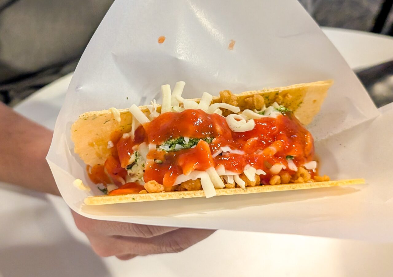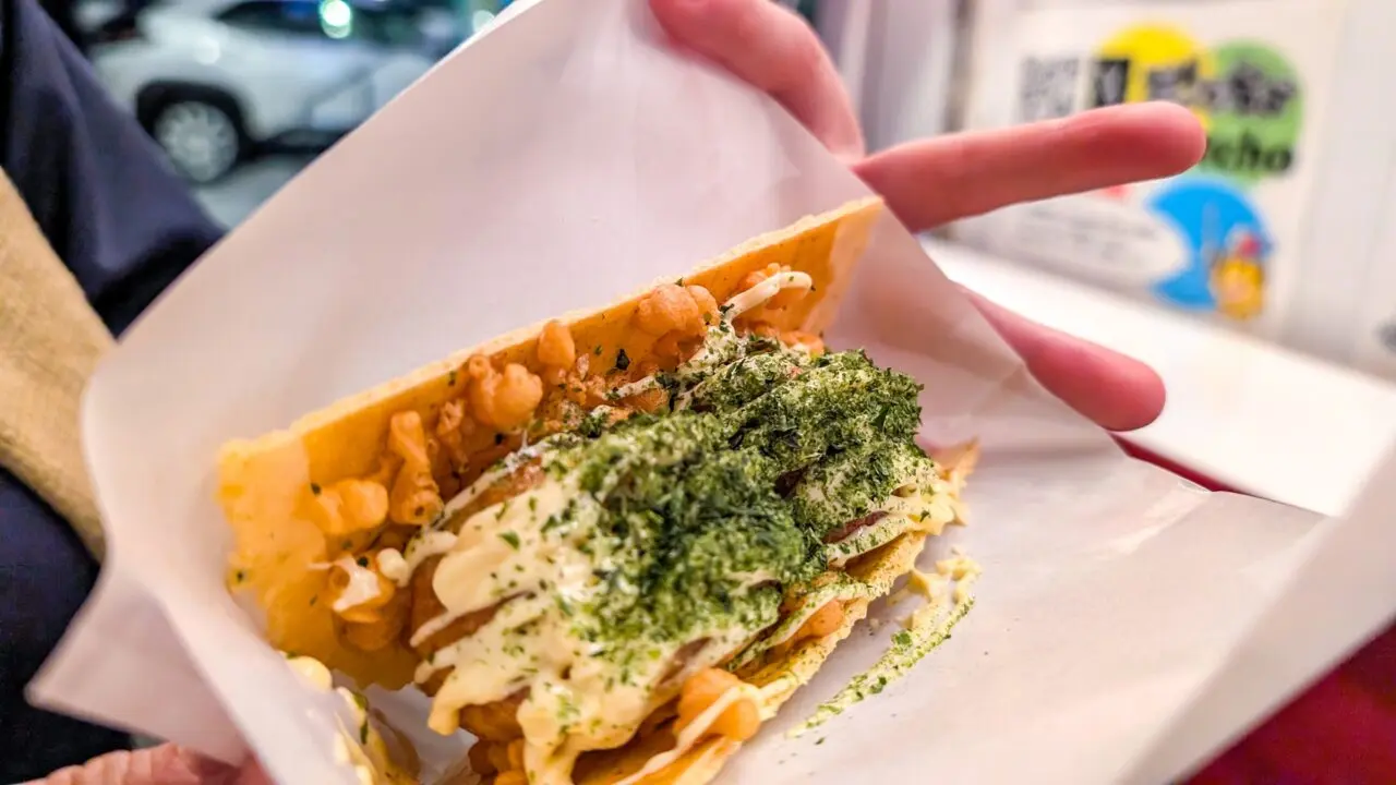 人気がありすぎて、もしかしたら数量限定などでレギュラー化するかもしれないとのことですが、まだ決まってはいないそうです。新メニュー登場までのつなぎということだったので、いつ販売終了となるか分からない「たこせん」。その場でえびせんのパリパリ食感とともに味わってみてください。ちなみに、たこ焼きをつぶしてせんべいに完全に挟む形で個人的には味わいました。